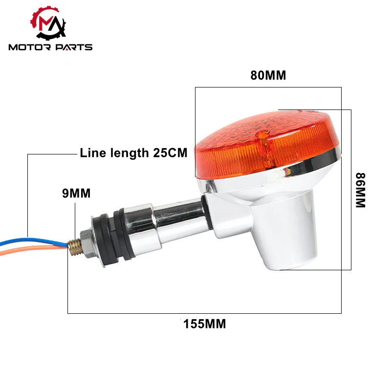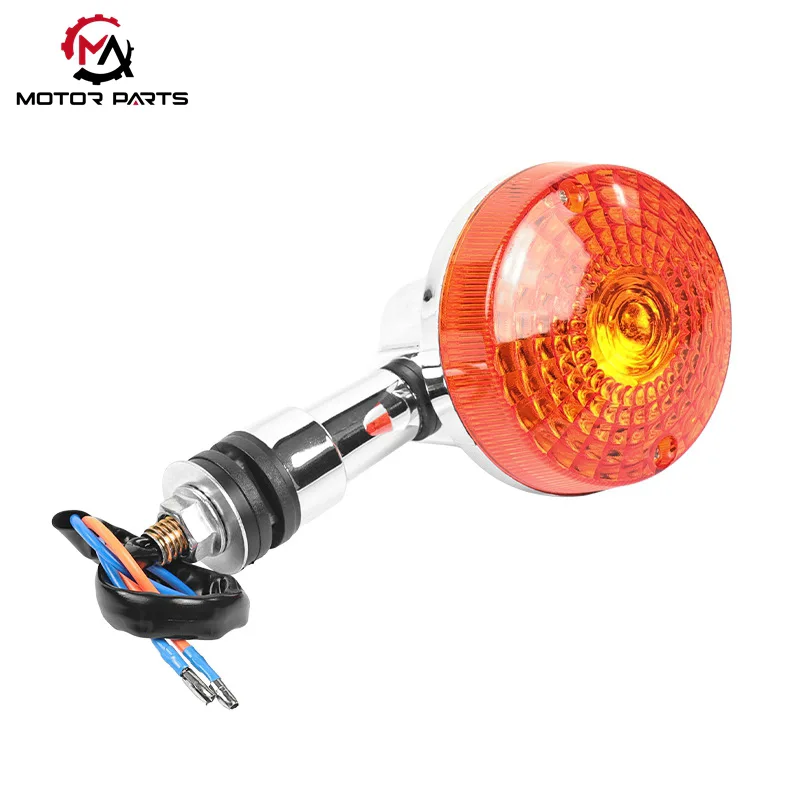 டர்ன் சிக்னலின் புல்லட் வடிவம் நிக்கல் பூசப்பட்ட சட்டகம் மற்றும் ஒரு வட்ட விளக்கு தலையுடன் இணைக்கப்பட்டுள்ளது.