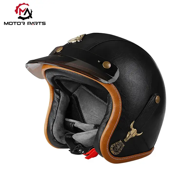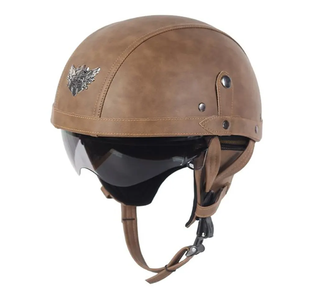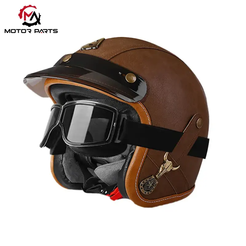 • கண்ணாடியுடன் கூடிய மோட்டார் சைக்கிள் ஹாஃப் ஃபேஸ் ஹெல்மெட் லெதர்கண்ணாடியுடன் கூடிய மோட்டார் சைக்கிள் ஹாஃப் ஃபேஸ் ஹெல்மெட் லெதர்